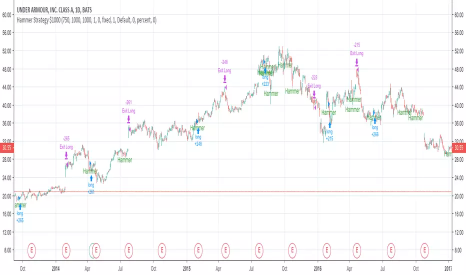 This is a basic strategy that will buy after a hammer is printed, and sell when a predetermined risk or reward price is hit. You can change the risk and reward values in the settings. Risk and reward values are in increments of $0.01. Default values are 75 ($0.75) and 200 ($2.00). If the strategy is producing losses, try adding a zero to the end of the risk value and the reward value. Example: Higher valued stocks may do better with a Risk of 750 ($7.50) and a Reward of 2000 ($20.00). Maybe even a Risk of 750 ($7.50) and reward of 1000 ($10.00). Play around with these values to get the best result for different charts. Initial investment is set to $1000